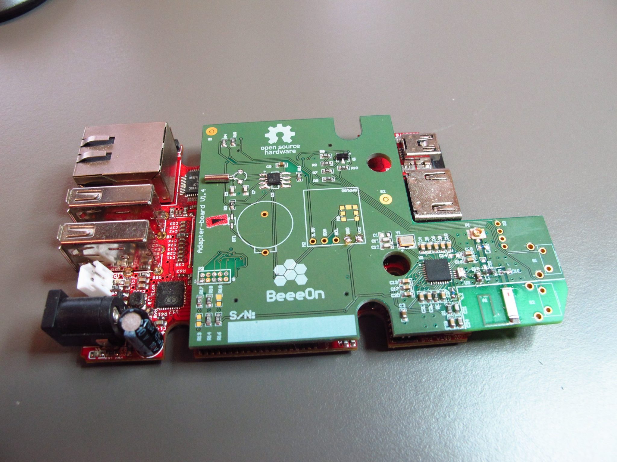 This is the prototype of the radio communication module for sensors operating at 868 MHz (ie. unlicensed band). It connects to the board Olinuxino A10S from the manufacturer Olimex.