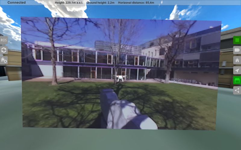 The resulting application was developed using the Unity game engine. For creating the 3D virtual environment, the environment maps and heightmaps are loaded from external sources in order to create the terrain in Unity (maps, 3D building models, textures, heights). Next, flying informations and sensory data are transmited to the application from the drone and visualized (pose, height, video-stream, battery status, flight speed, flight mode).