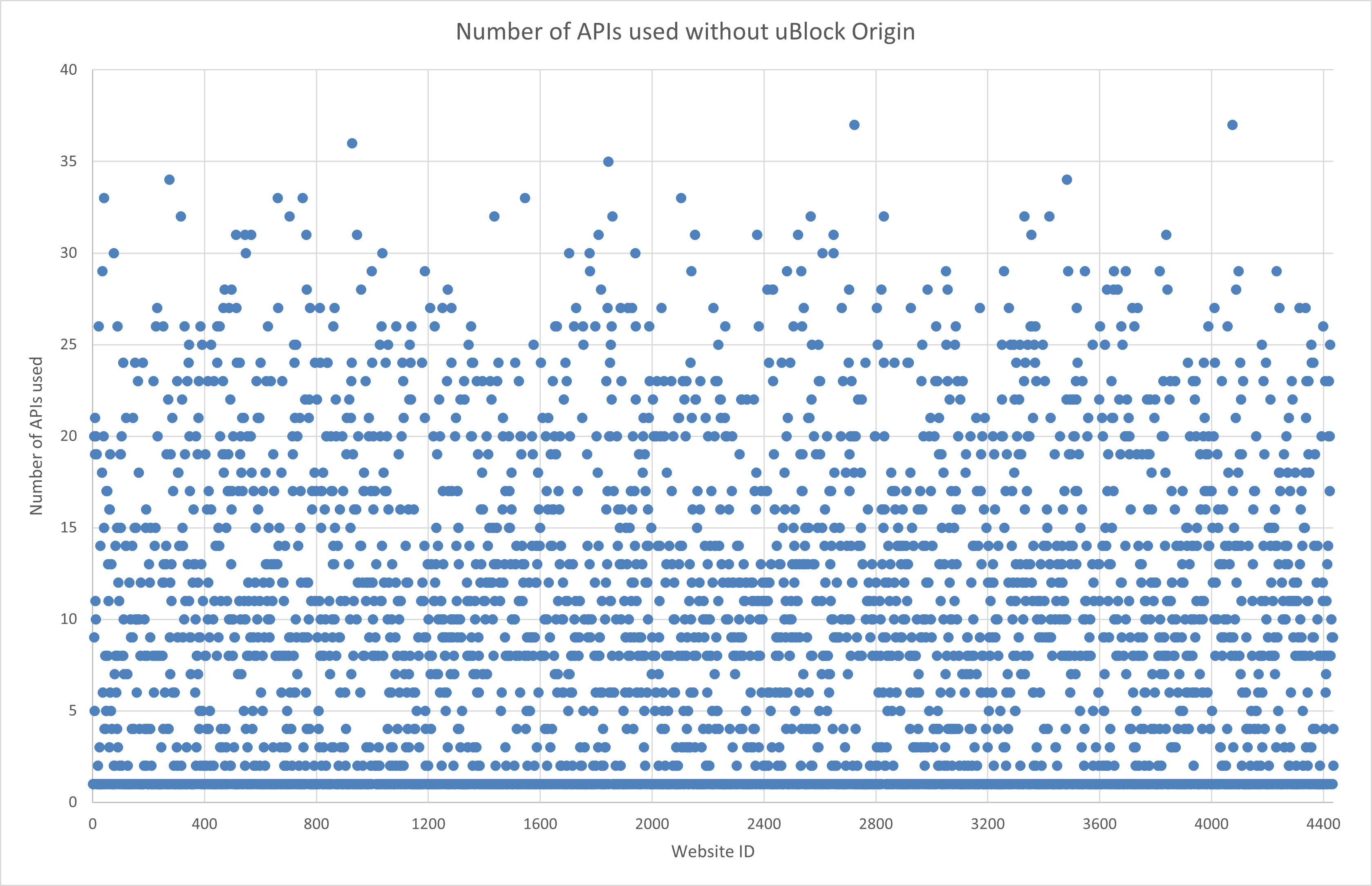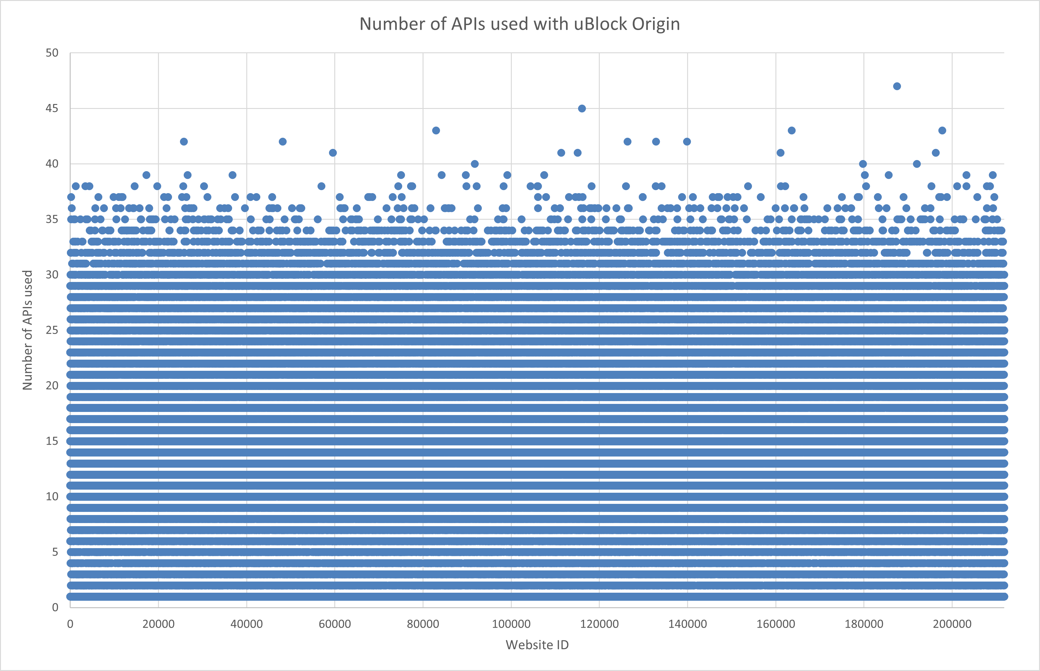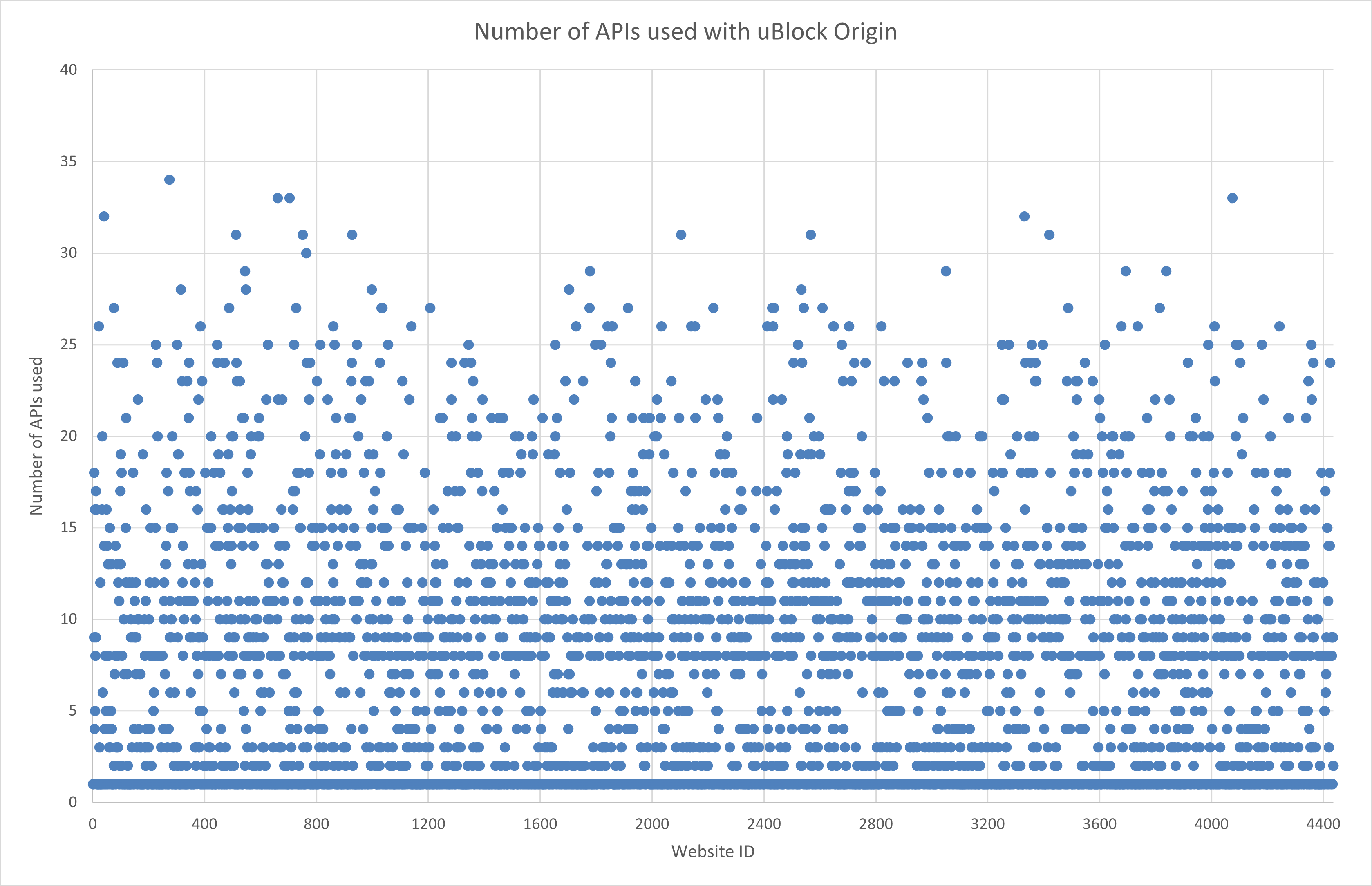 Using the tool, for example, we found that on the 250 thousands most visited websites (according to the Tranco list), with the security extension uBlock Origin, approximately 30% of all JavaScript calls were blocked, when the API Range was suppressed the most. The complete results were published on the FIT cloud.
