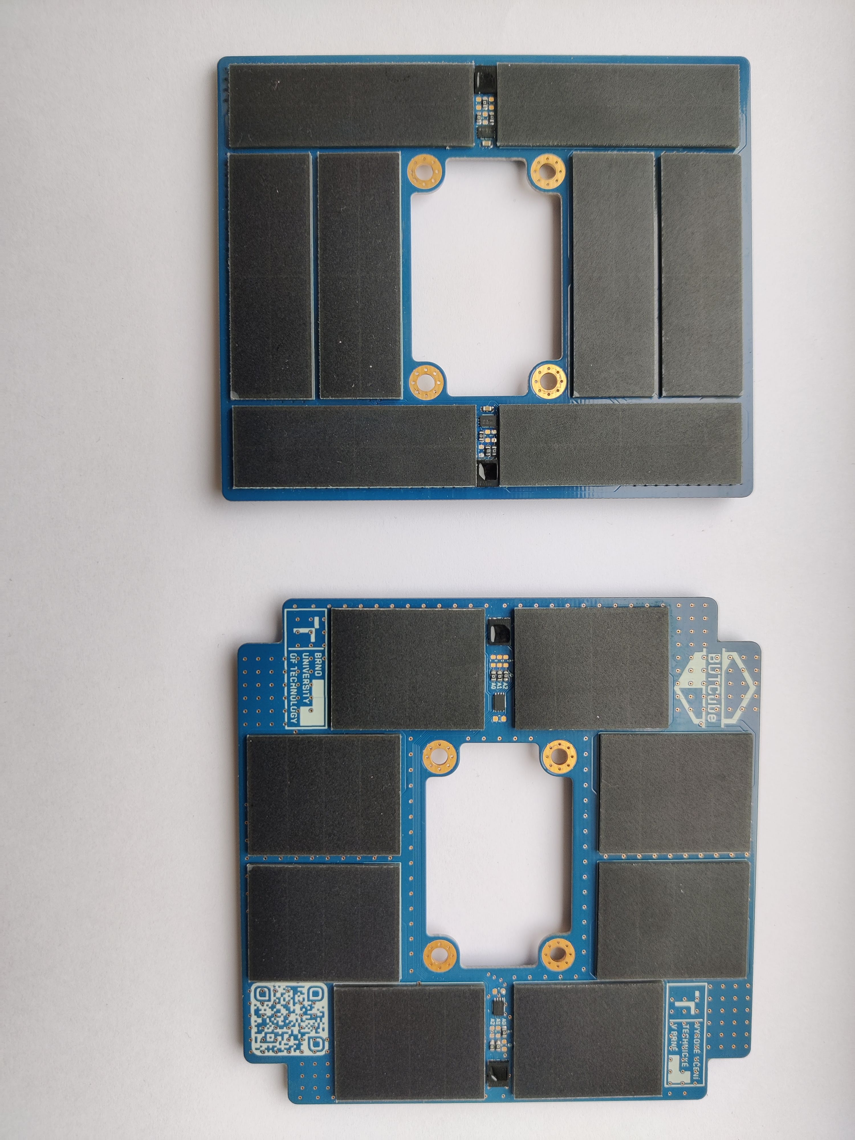 Solar unit for BUT Cube satellite. Serves as the main power supply for the satellite. The unit is available in two variants, the first one can be placed on the sides of the satellite (X+, X-, Y+, Y-), the second variant is for placing on the top/bottom face (Z+, Z-). Functionally and in parameters the units do not differ from each other, only the shape of the unit and the format of the solar cells mounted on it are different.